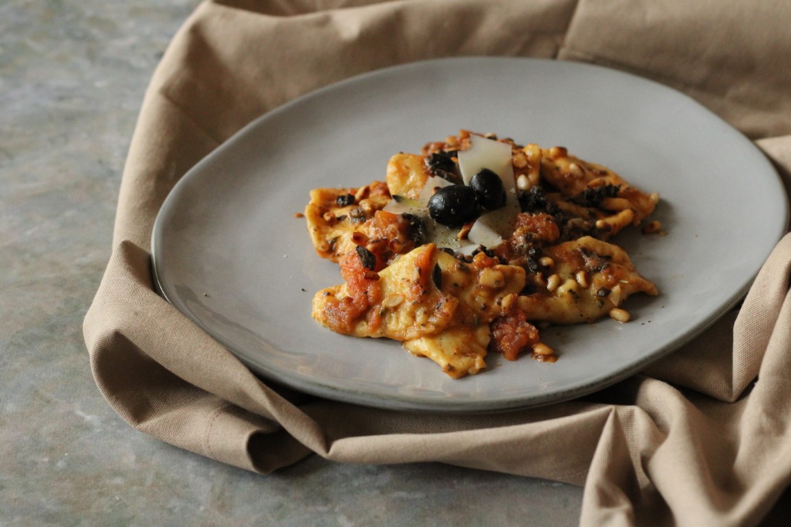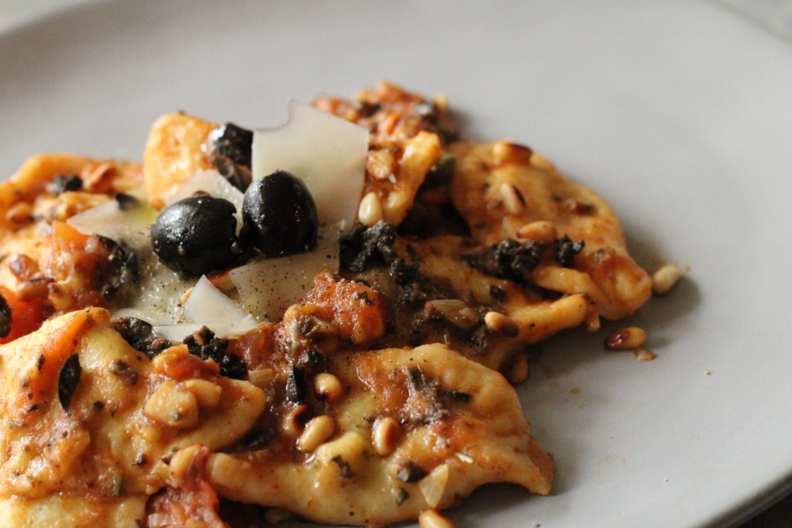 U tavu na laganu vatru dodajte 2-3 žlice maslinovog ulja, 1 žličicu maslaca i kuhane raviole. Sve skupa promiješajte i popržite raviole dok ne poprime zlatnu boju. Zatim dodajte 3 protisnuta režnja češnjaka, 2 žličice kapara i sve skupa promiješajte. Ogulite 2-3 rajčice, odstranite tvrde dijelove, a mekane narežite na kockice i dodajte u tavicu zajedno s 1/2 čaše vode u kojoj su se kuhali ravioli. Miješajte povremeno dok se sve ne sjedini u umak (oko 5 min). U međuvremenu sa štapnim mikserom usitnite masline, dodajte ih u tavicu skupa s tostiranim pinjolima i sve skupa začinite s malo soli, papra i dalmatinskim začinskim biljem. Promiješajte i poslužite.