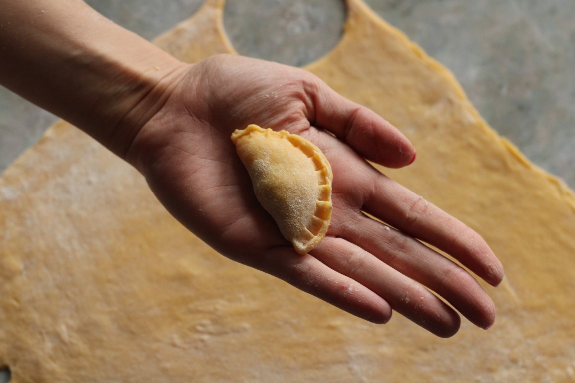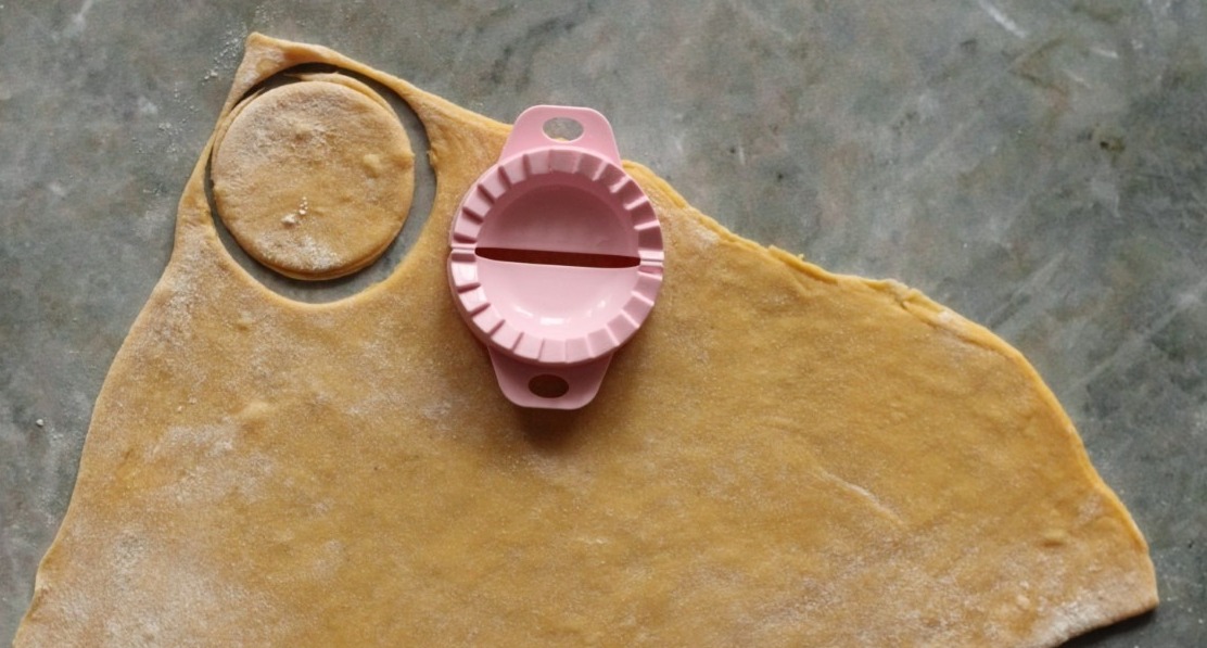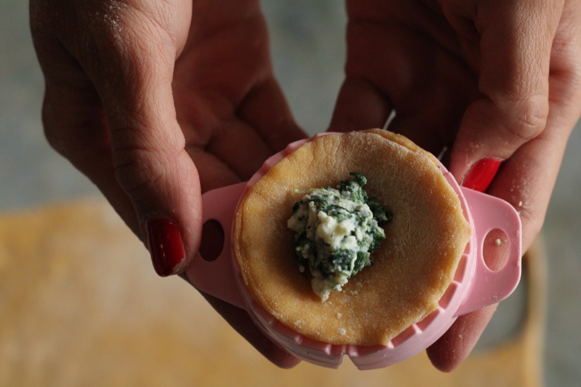 Nakon što je tijesto odstajalo pola sata, pobrašnite podlogu i razvaljajte ga na debljinu oko 3mm. Za oblikovanje raviola ja sam koristila kalup. Ukoliko ga nemate, možete uz pomoć čaše oblikovati krugove, a služeći se vilicom zatvoriti rubove. Krugove punimo s otprilike žličicom nadjeva, pazeći da ih ne prepunimote ih preklapamo na pola i zatvaramo.