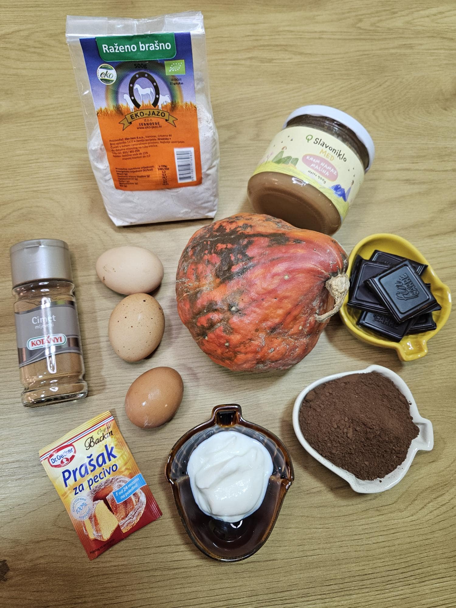 2. Umuti mokre sastojke - jaja, med, grčki jogurt, otopljenu tamnu čokoladu i pire od tikve.