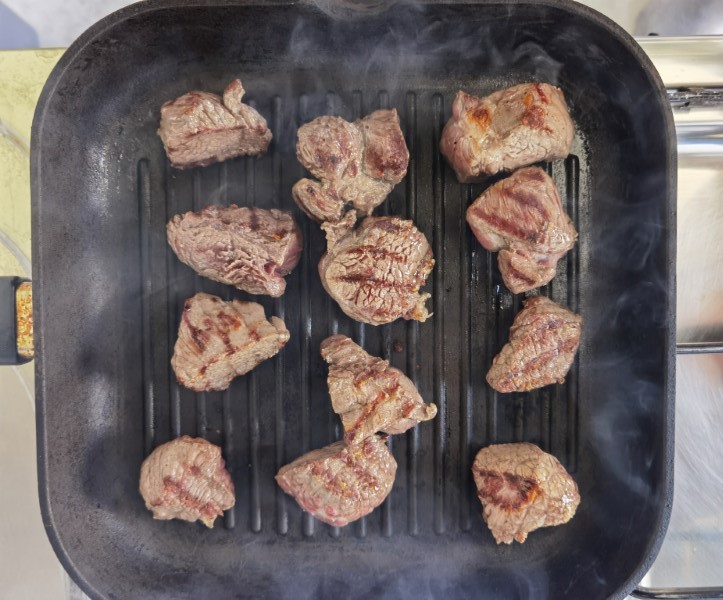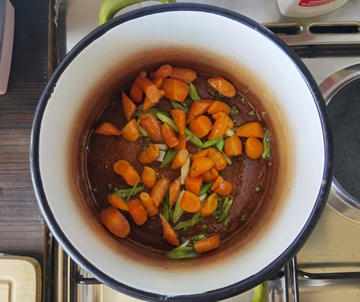 Na dobro zagrijanoj tavi kratko pečemo komade junetine dok sa svih strana ne dobiju boju, a istovremeno u dubljoj posudi s debelim dnom na maslinovom ulju pirjamo mrkvu i mladi luk.