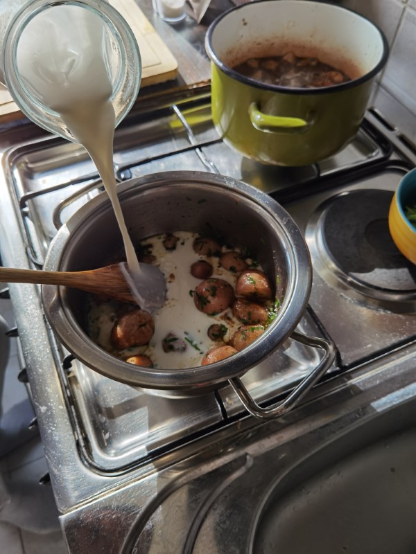 Nakon što krumpiri dobiju zlatno smeđu boju dodajemo im sjeckani peršinov list, sol, papar i podljevamo ih sa otprilike pola litre mlijeka te kuhamo narednih 20 minuta ili dok krumpiri ne budu kuhani, a mlijeko reducirano.