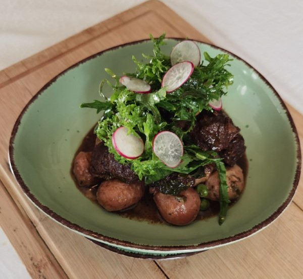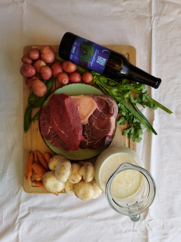 Kada nam je meso potamnilo sa svih strana vadimo ga iz tave i prebacujemo u posudu u kojoj se pirja povrće te sve podlijevamo sa Kataklinger porterom i vodom. Jelo je od ovog trenutka potrebno kuhati dva sata na laganoj vatri uz povremeno miješanje.