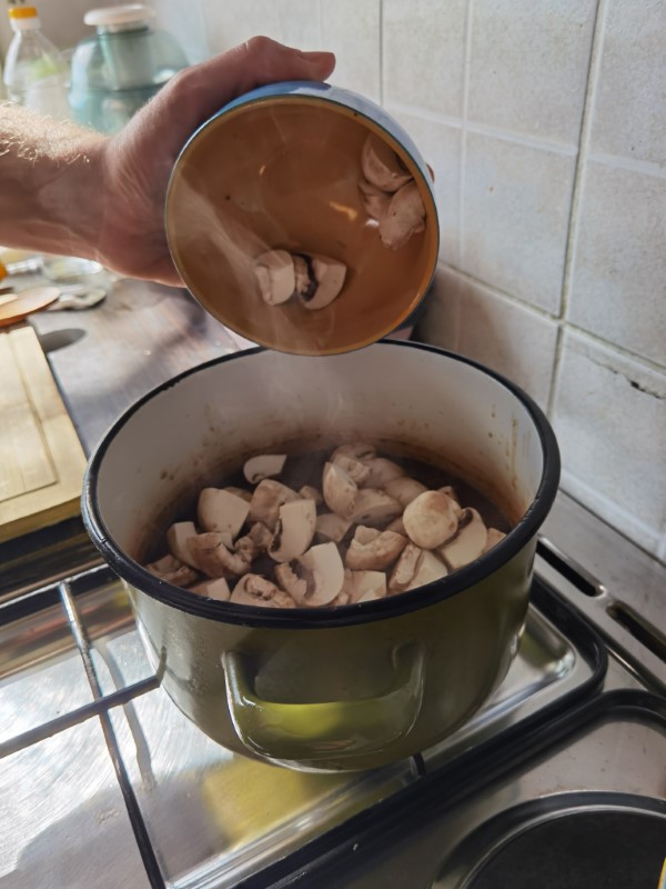 Narezane šampinjone dodajemo pola sata prije kraja kuhanja te listove kelja i mladi grašak za zadnjih 5 minuta. Prije posluživanja isprobati te po potrebi začiniti.