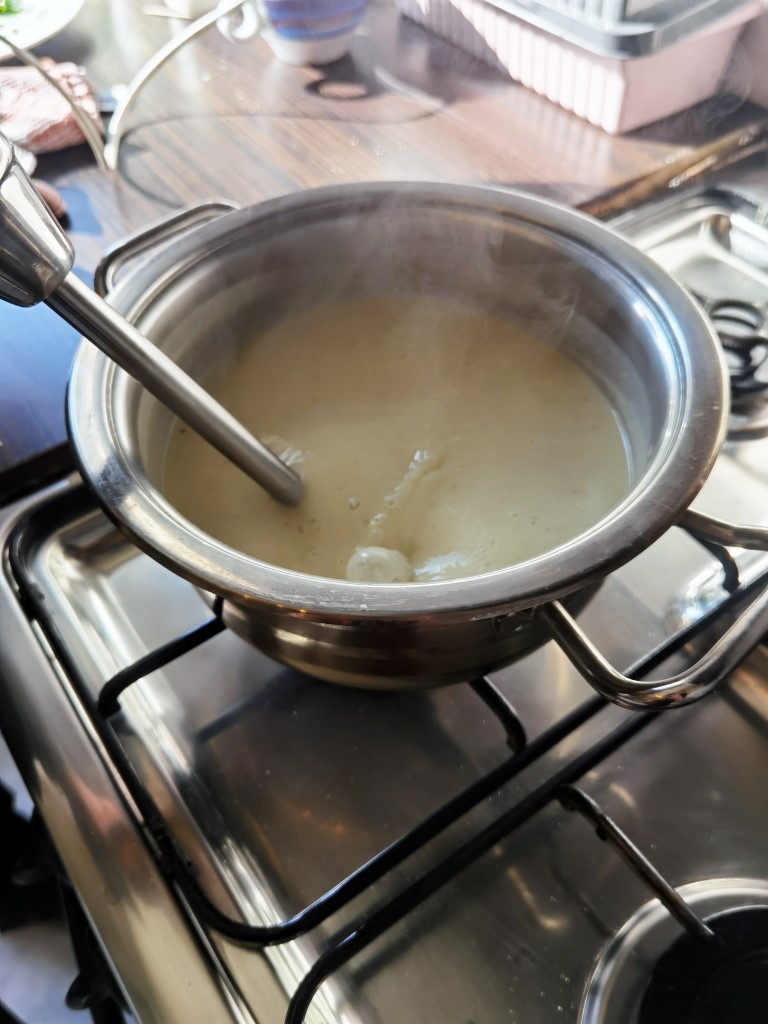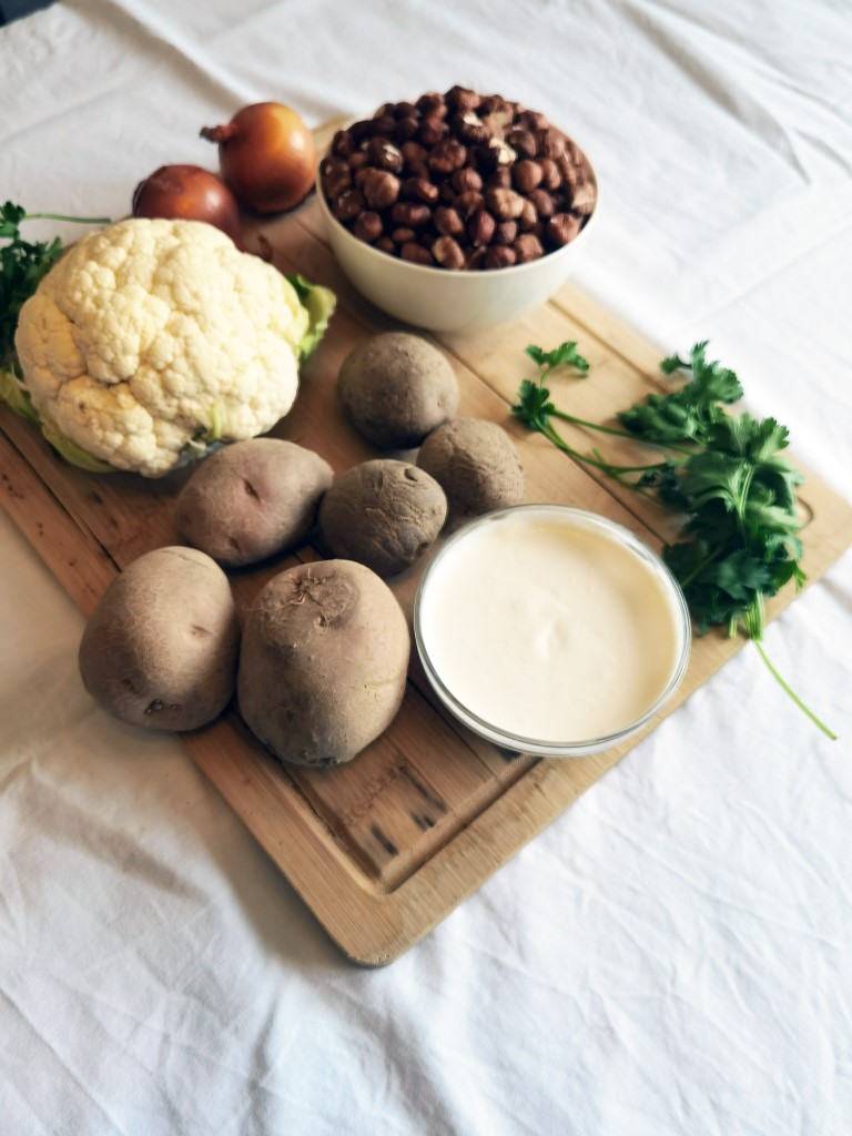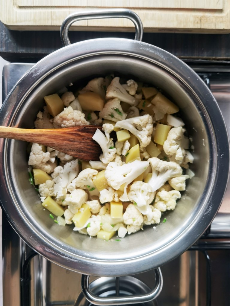 Cvjetaču, luk i krumpir narežite na veće komade te ih pirjajte u većem loncu na malo maslinova ulja ili maslaca. Nakon par minuta pirjanja povrće podlijemo vodom ili povrtnim temeljcem i nastavimo kuhati 15 do 20 minuta.