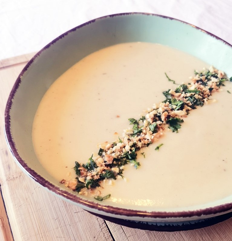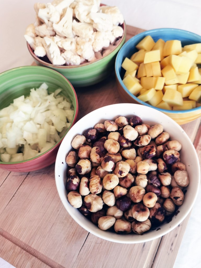 Dok se povrće kuha u manjoj tavi tostiramo lješnjake na srednje jakoj vatri dok se opna ne počne odvajati od jezgre, a lješnjaci dobiju zlatno smeđu boju. Tostirane lješnjake usitnjavamo nožem te jedan dio dodajemo u juhu prije pasiranja, a manji dio sačuvamo za dekoriranje gotove juhe. Kada je povrće dovoljno kuhano da se raspada kada ga pritisnemo vilicom juhu možemo ispasirati štapnim mikserom.