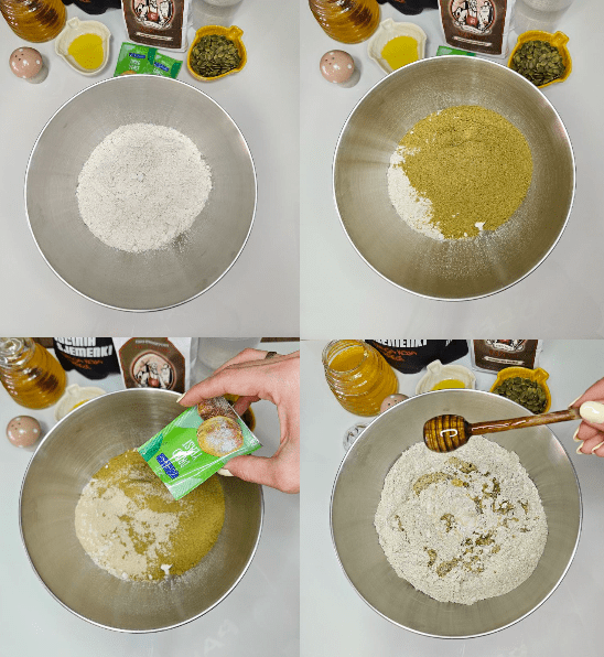 1. U većoj zdjeli pomiješaj raženo brašno, bučin protein, sol i suhi kvasac.