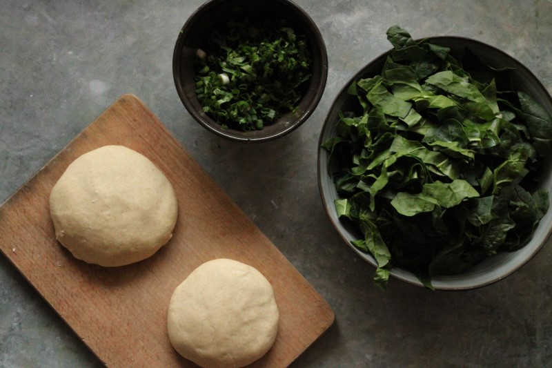 U većoj posudi pomiješamo blitvu, mladi luk i peršinov list. Začinimo sve sa žličicom soli i 3 žlice maslinovog ulja i dobro promiješamo. Pećnicu zagrijemo na 200 °C. Obje polovice tijesta razvaljamo u obliku kruga, a onu manju stavimo na dno pleha koji smo premazali uljem i pobrašnili s malo brašna. Zatim dodamo nadjev.