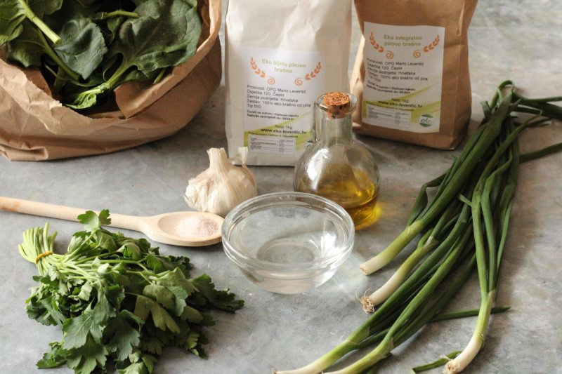 Oprati blitvu, ukloniti stabiljke i tvrđe dijelove, te ju dobro posušiti čistom kuhinjskom krpom. Zatim ju narežemo na trakice. Mladi luk i peršinov list također narežemo na sitno.