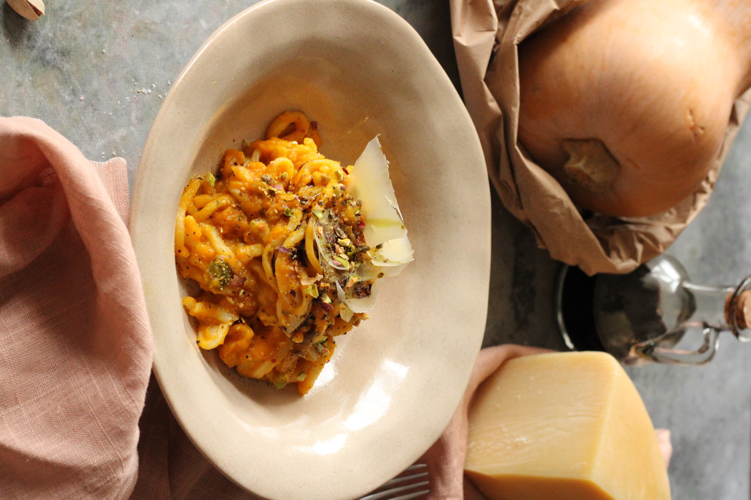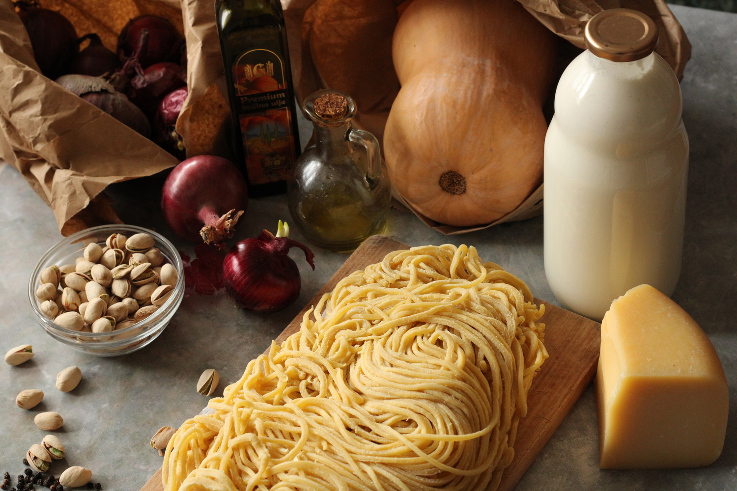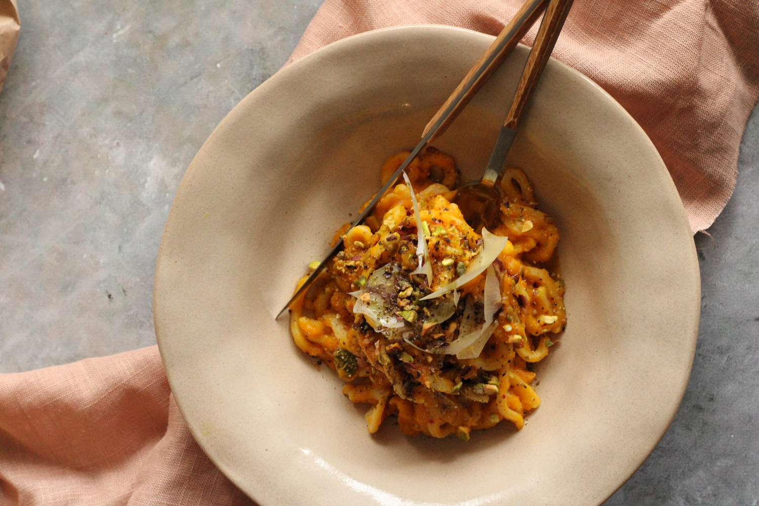 U tavu dodati žlicu maslinovog ulja, skuhanu tjesteninu, umak od tikve i komadiće pistacija. Začiniti sve skupa s malo soli, papra i naribanog muškatnog oraščića. Na laganoj vatri sve skupa sjediniti miješajući 3-5min.