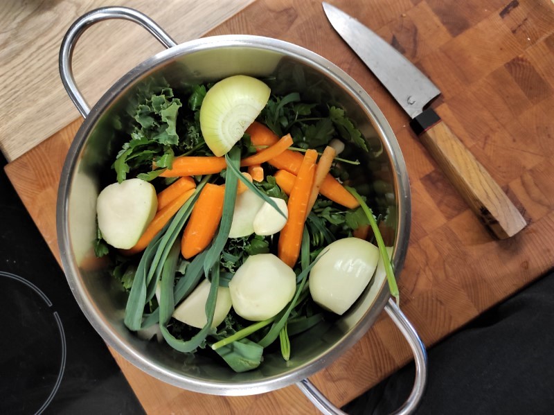 Vodu staviti u lonac, posoliti i staviti očišćeno i narezano povrće, kada je povrće kuhano izvaditi ga van i izmiksati u blenderu (ukloniti lovor). Vratimo izmiksanu smjesu nazad u lonac s ostatkom vode od kuhanja i pustimo da nam juha zakuha.