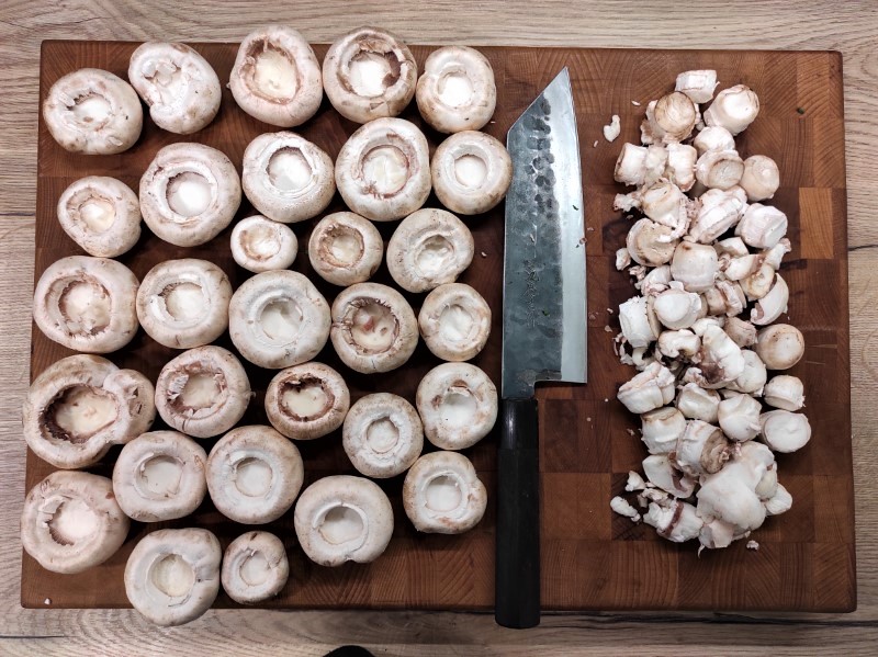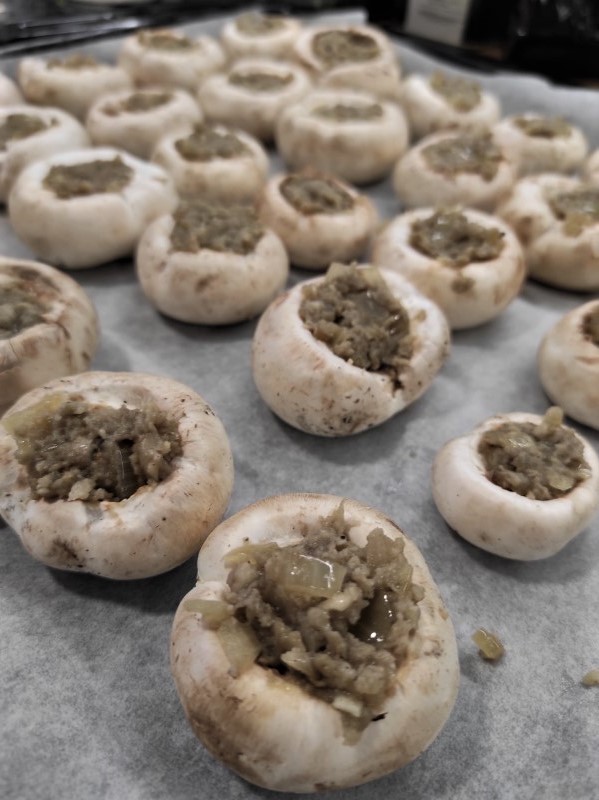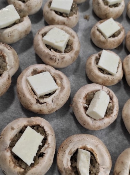 Na jako malo masnoće prodinstamo luk i dodamo mu izmiksane stabljike gljiva, dodamo i začine (sol, papar i muškatni oraščić). Kada se smjesa poveže napunimo klobuke i gore stavimo komadić sira.
