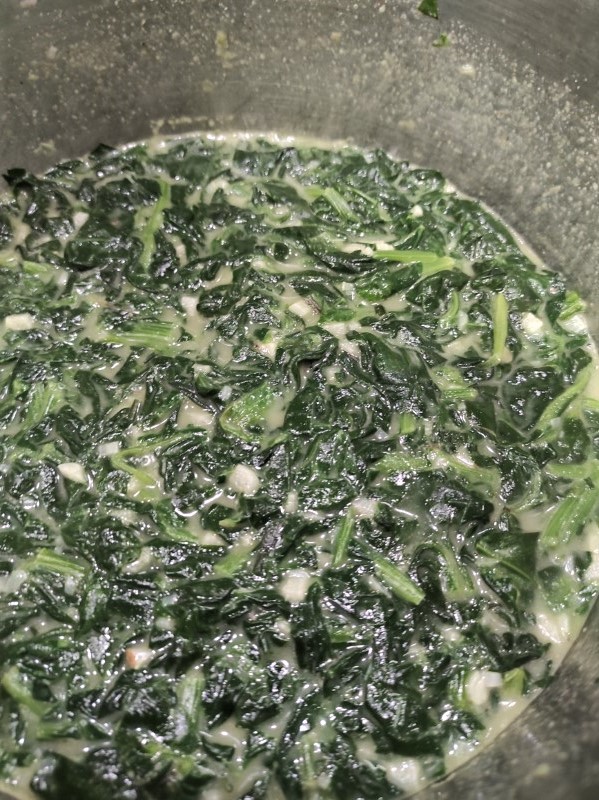 Špinat operemo i odrežemo debele stabljike, češnjak narežemo na jako sitno. Na malo masnoće prodinstamo bijeli luk (ne smije izgoriti) i dodamo špinat. Kada špinat uvene i ispari većina njegove tekućine (10-tak min) dodamo mlijeko, sol i papar. Sve dinstamo dok ne dobijemo jednu lijepu homogenu smjesu u koju dodamo 2 žličice vrhnja.