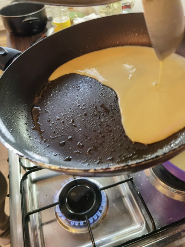 Smjesu za palačinke pravimo od dva cijela jaja koja izmutimo sa 250 ml mlijeka i tome postepeno dodamo ukupno količinu brašna dok ne dobijemo gustu smjesu bez grudica, a nakon toga dodajemo preostalih 250 ml mlijeka i prstohvat soli.