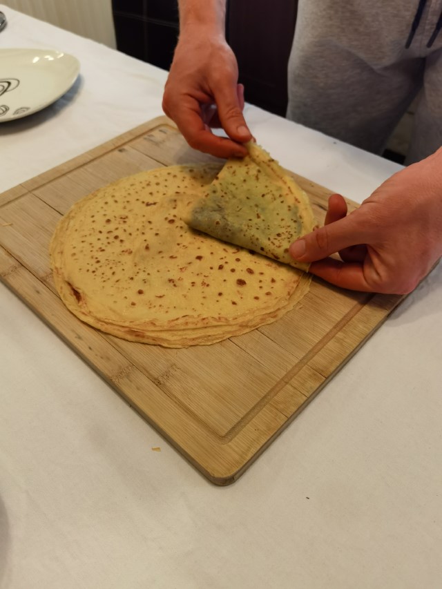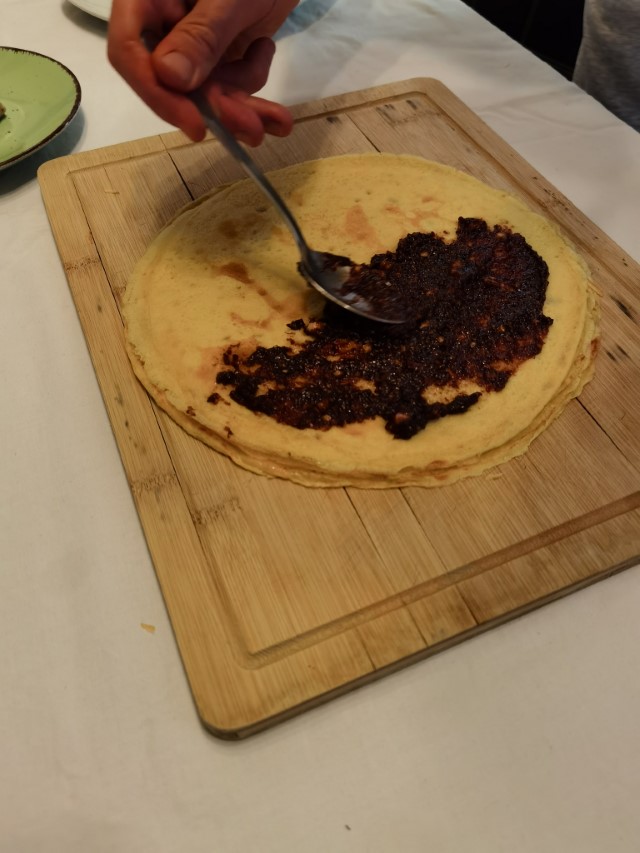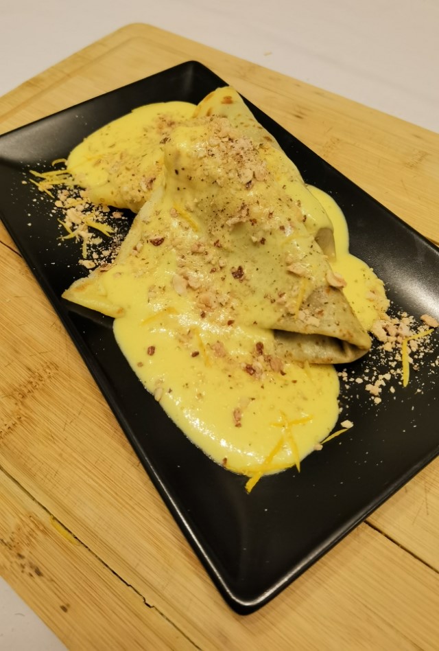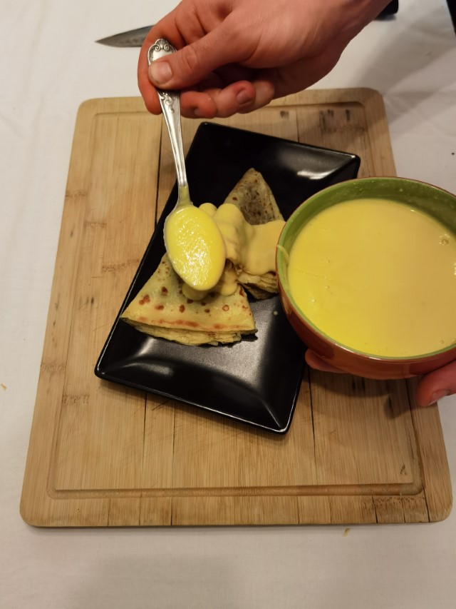 Svaku palačinku premazemo namazom od šljiva i karameliziranih lješnjaka, a na složene palacinke prelijemo creme anglaise.